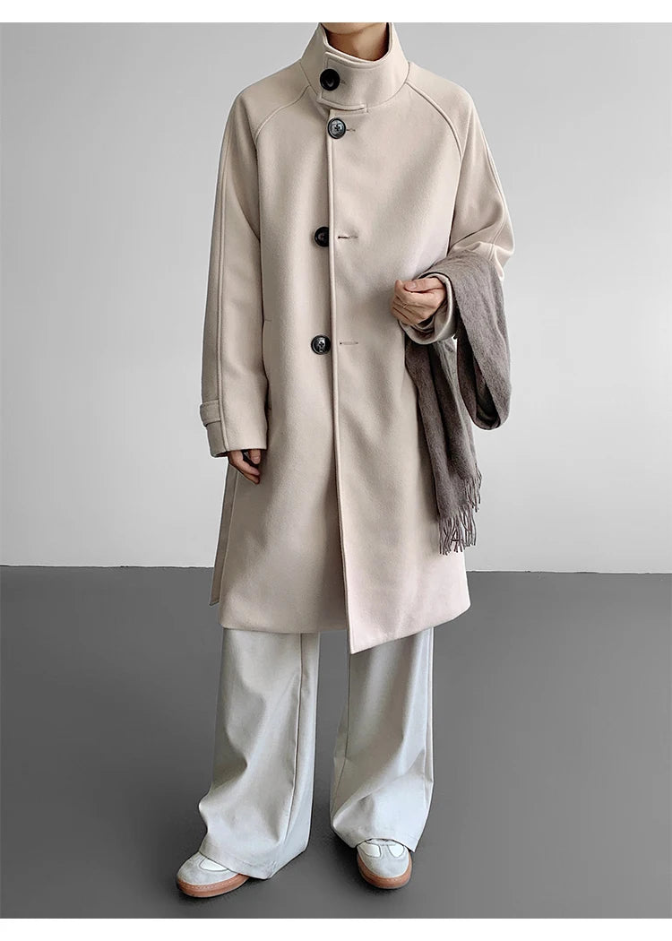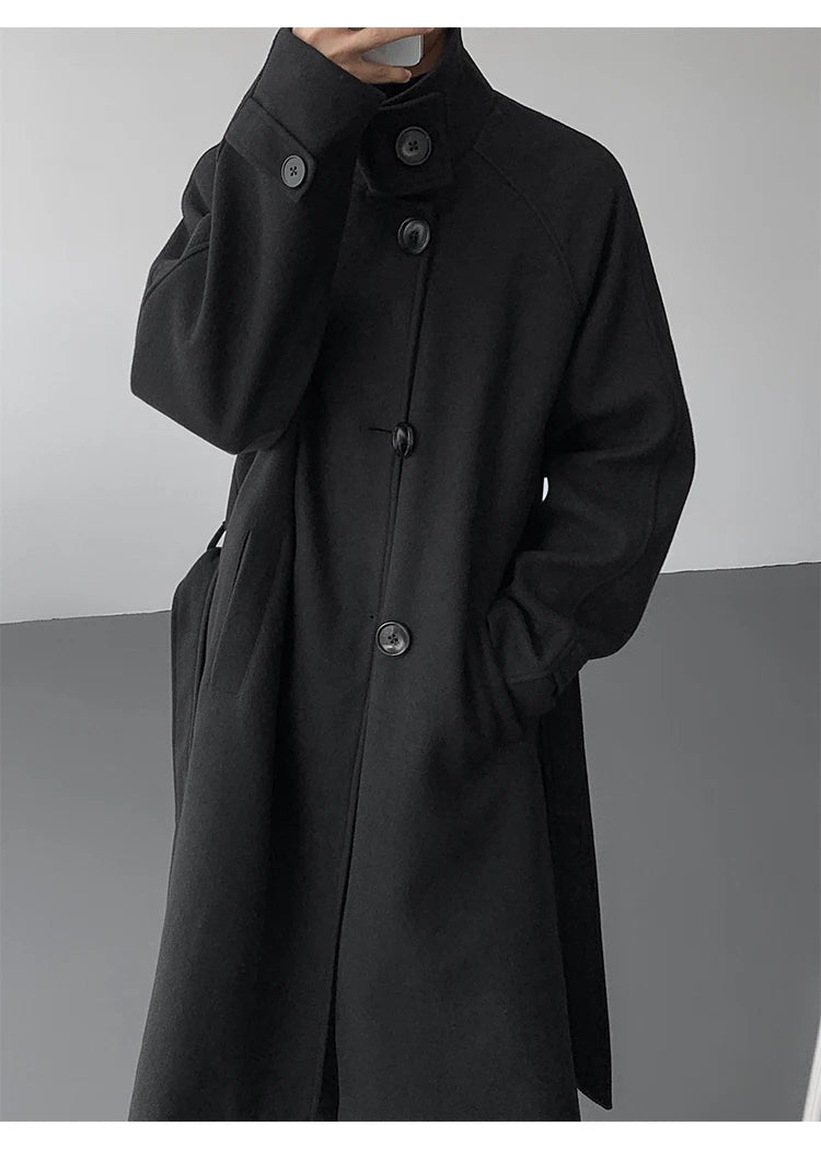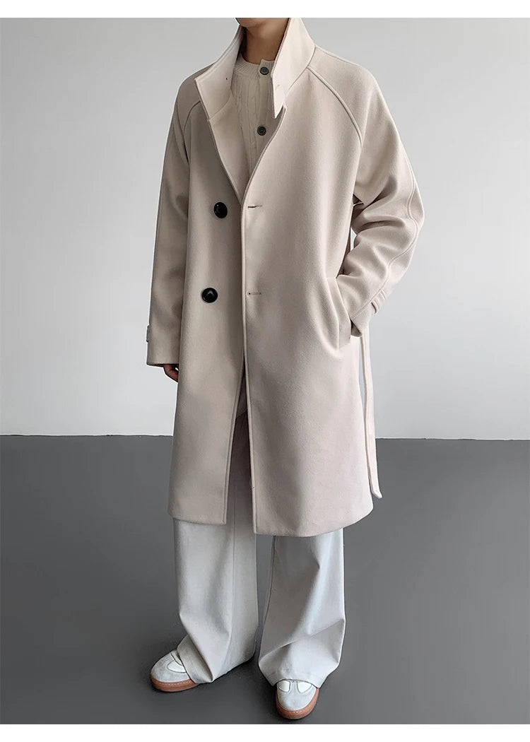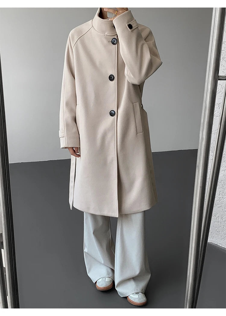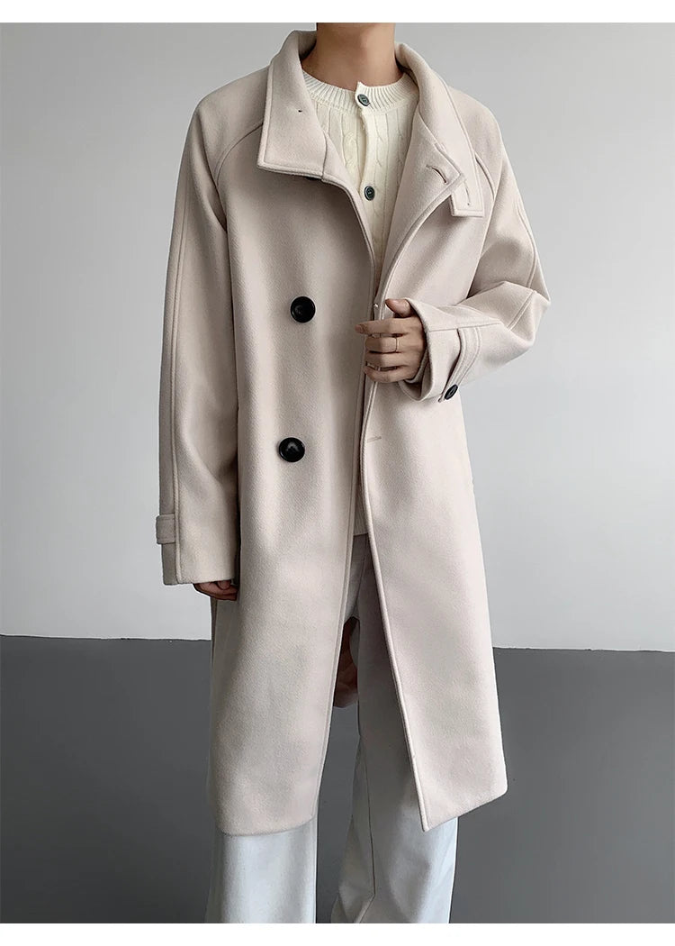 2025 New Autumn Winter Mens Imitation Wool Trench Coat Mid Length Stand Collar Solid Color Windproof Warm Two Button Outerwear