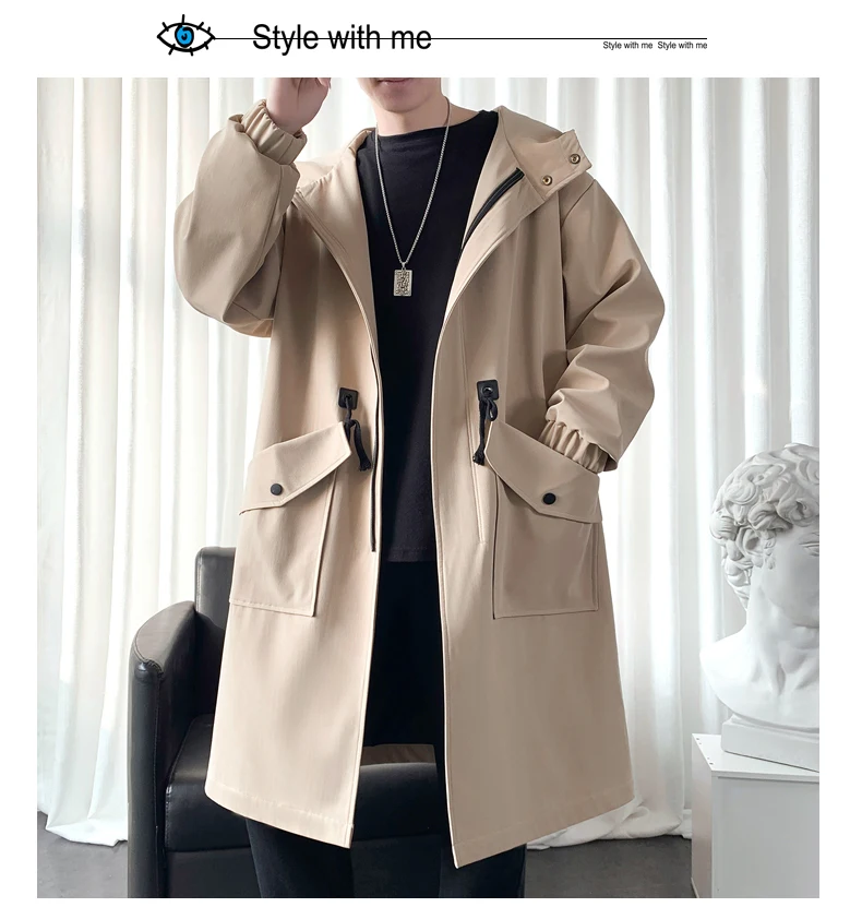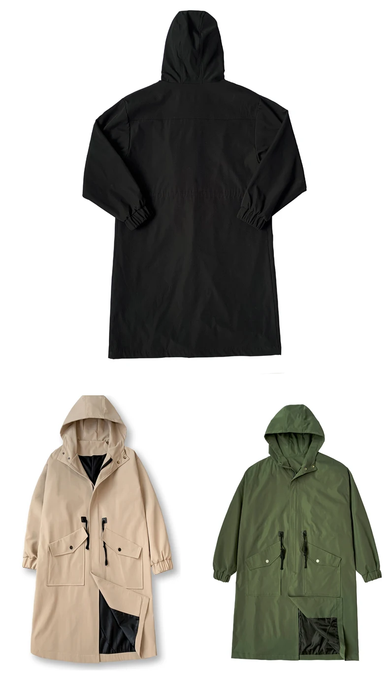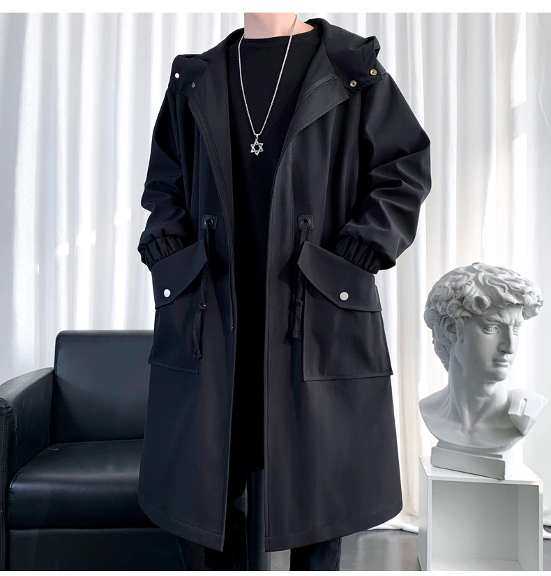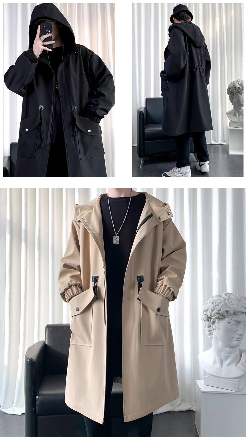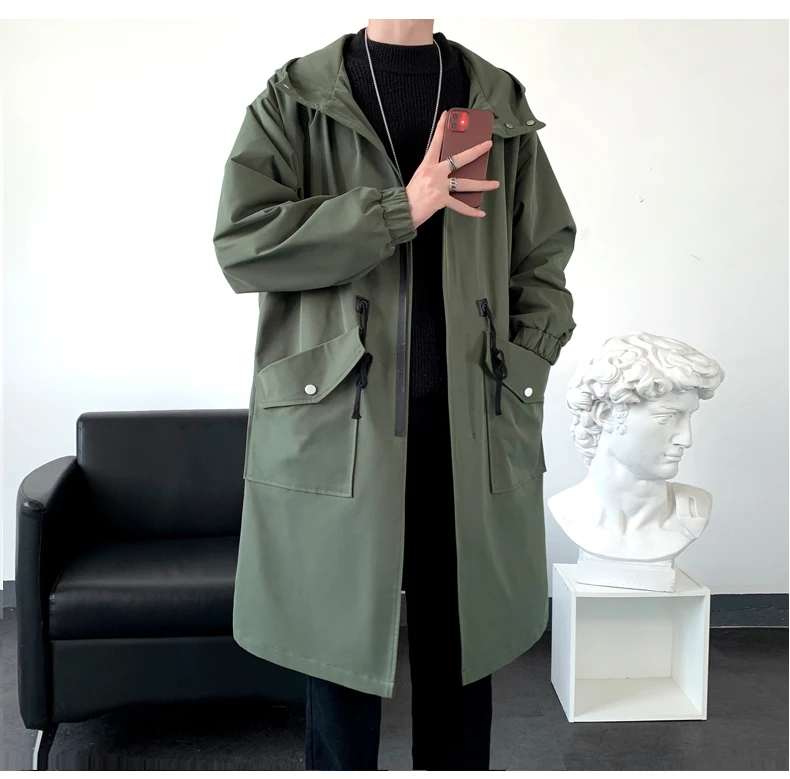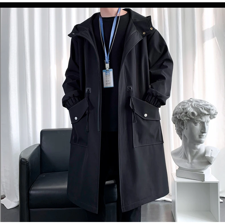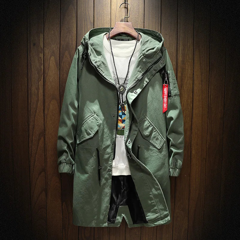 Long Trench Coat Jacket Men Cotton Autumn Spring Black Hip Hop Japanese Coats Streetwear Men's Hooded Army Green Casual Jackets