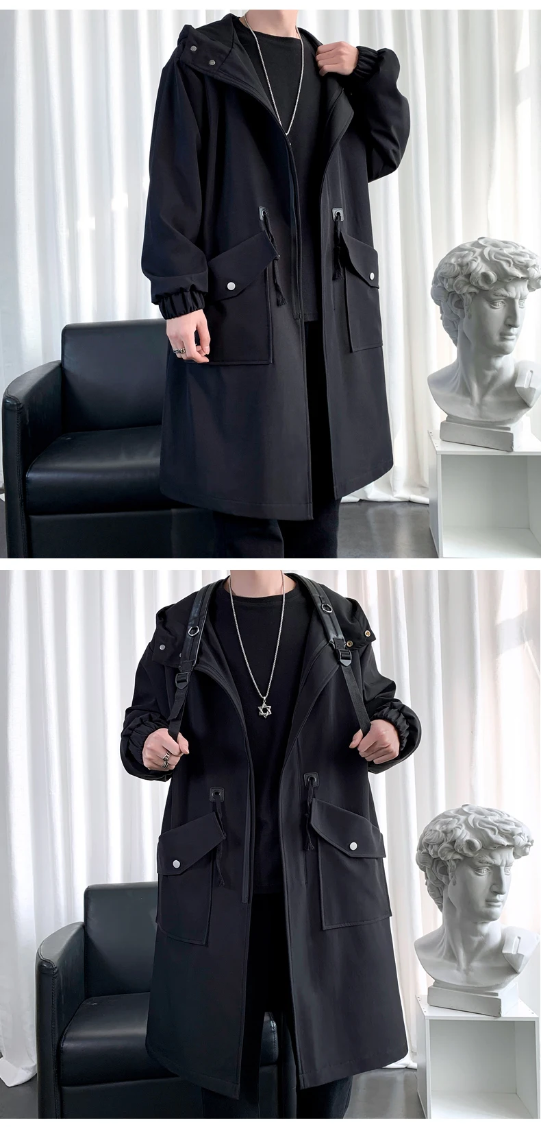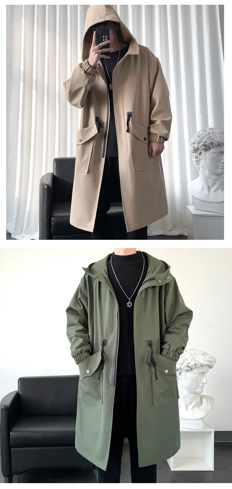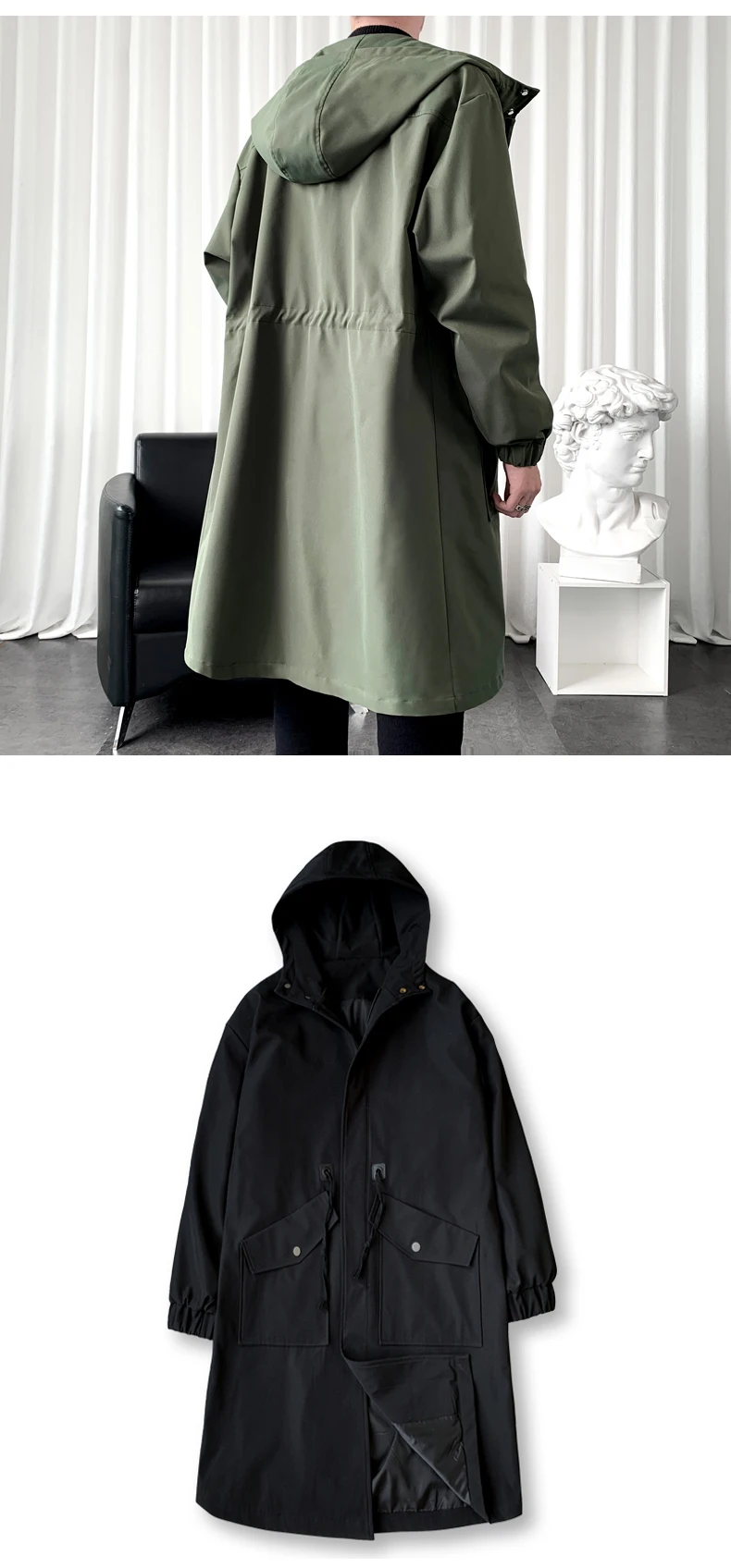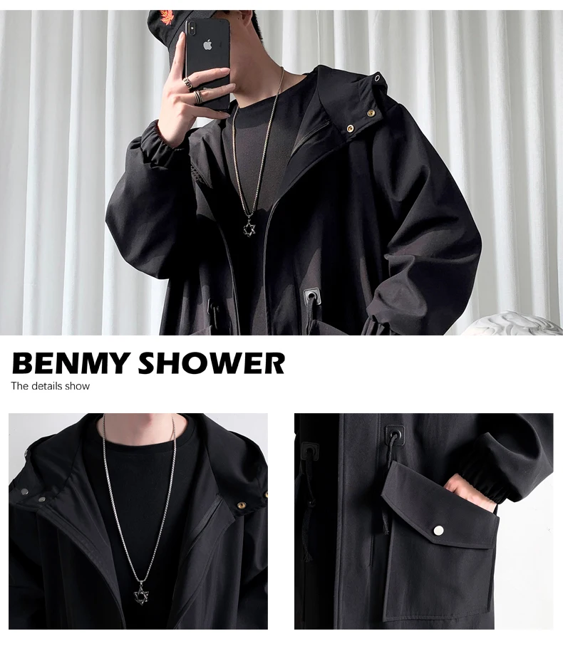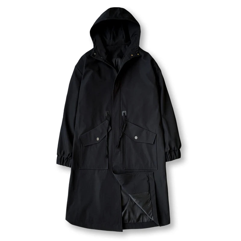 Long Trench Coat Jacket Men Cotton Autumn Spring Black Hip Hop Japanese Coats Streetwear Men's Hooded Army Green Casual Jackets