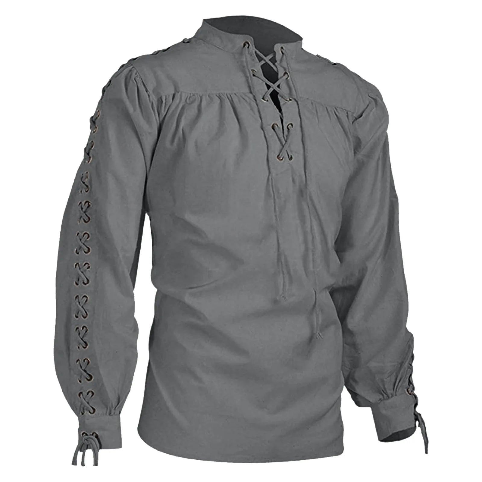 Shirts Men Tunic Viking Pirate Costume Gothic Clothes Men Vintage Shirt Ruffle Neckline Drawstring Knight Cosplay Top