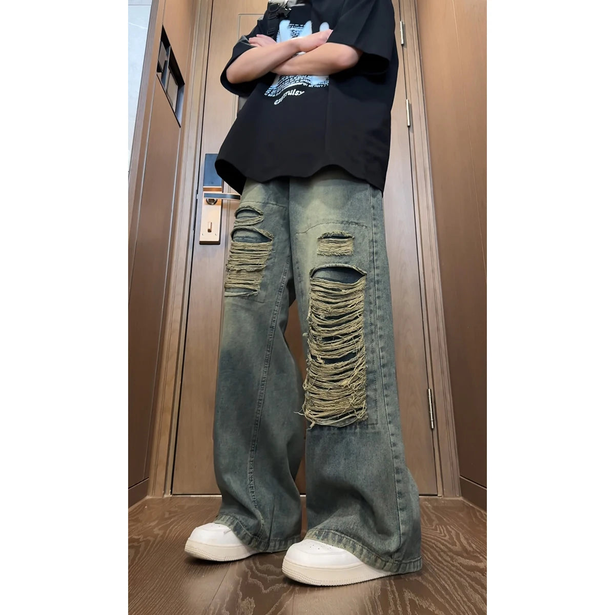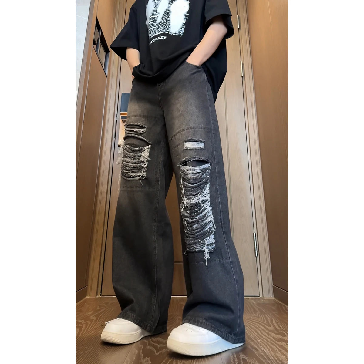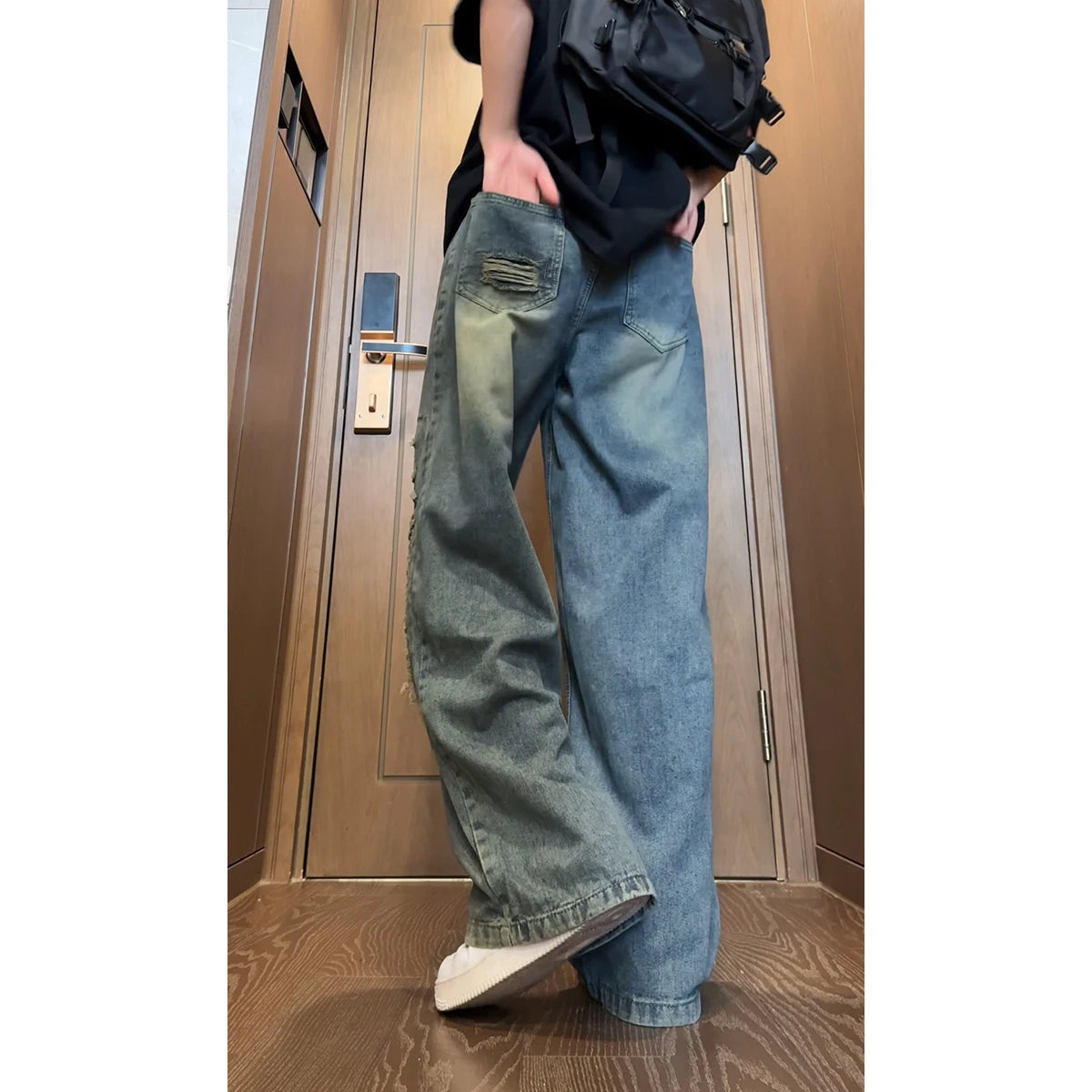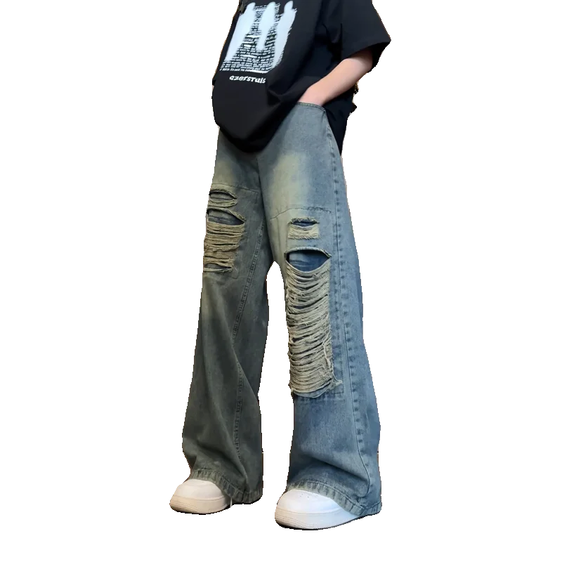Beggar jeans men Vintage Streetwear Ripped Hole Jeans Men Women Harajuku Aesthetic Wide Leg Denim Trousers Unisex Straight Pants