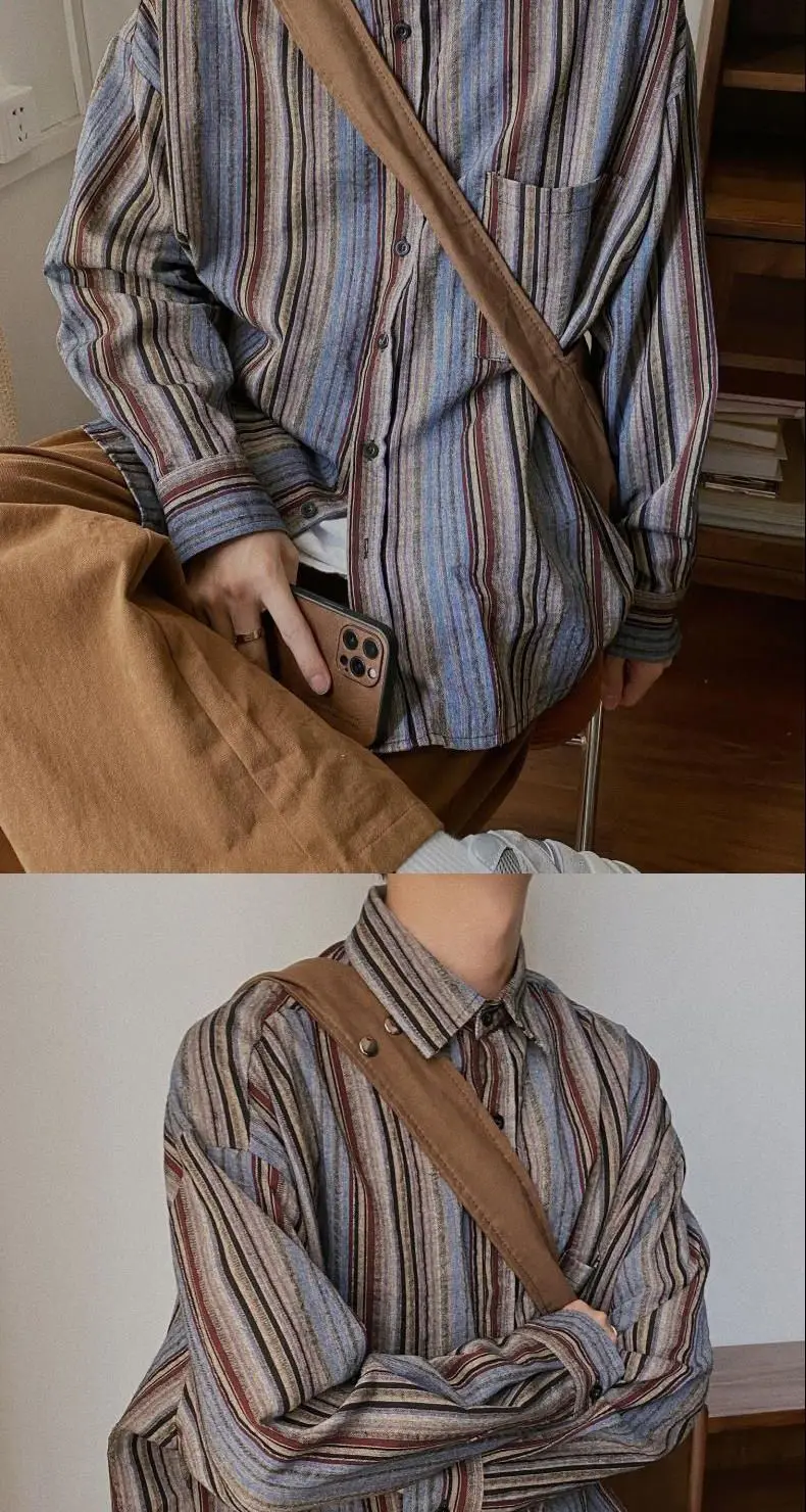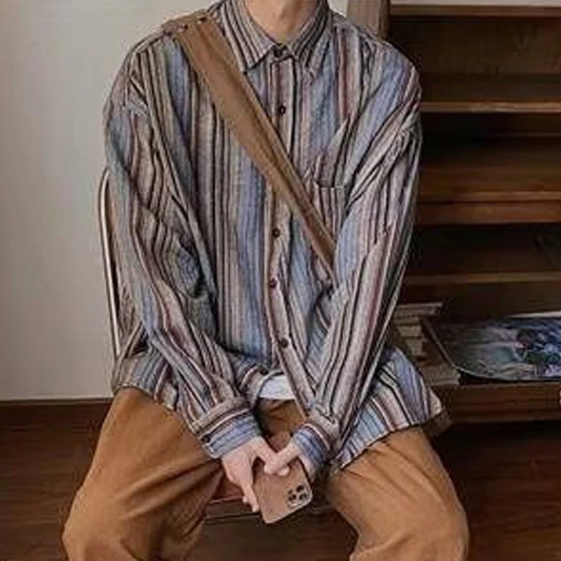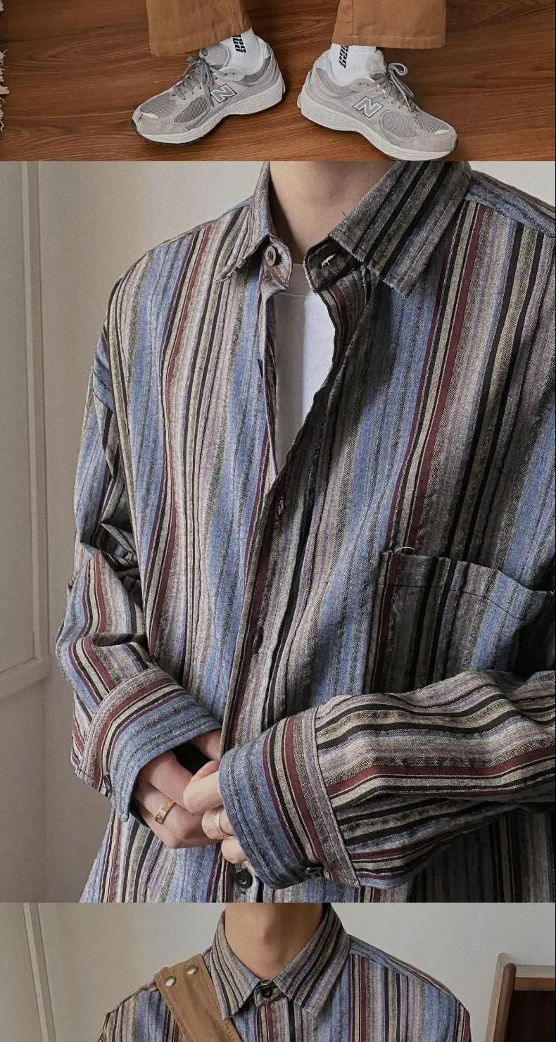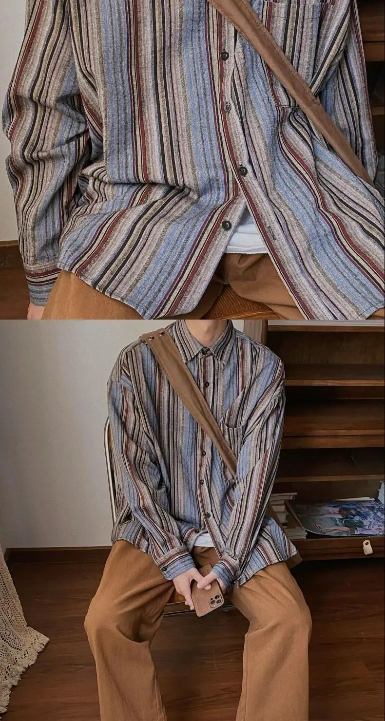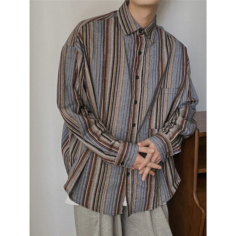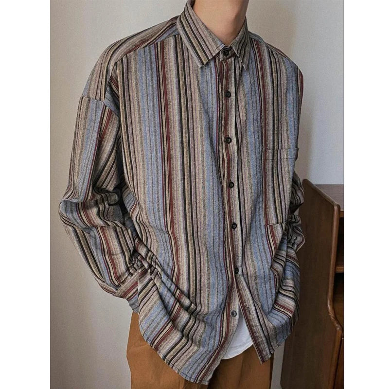Men's Trendy Japanese Style Vintage Striped Print Streetwear Shirt Spring Autumn Casual Long Sleeve Loose Tops Camisas De Hombre