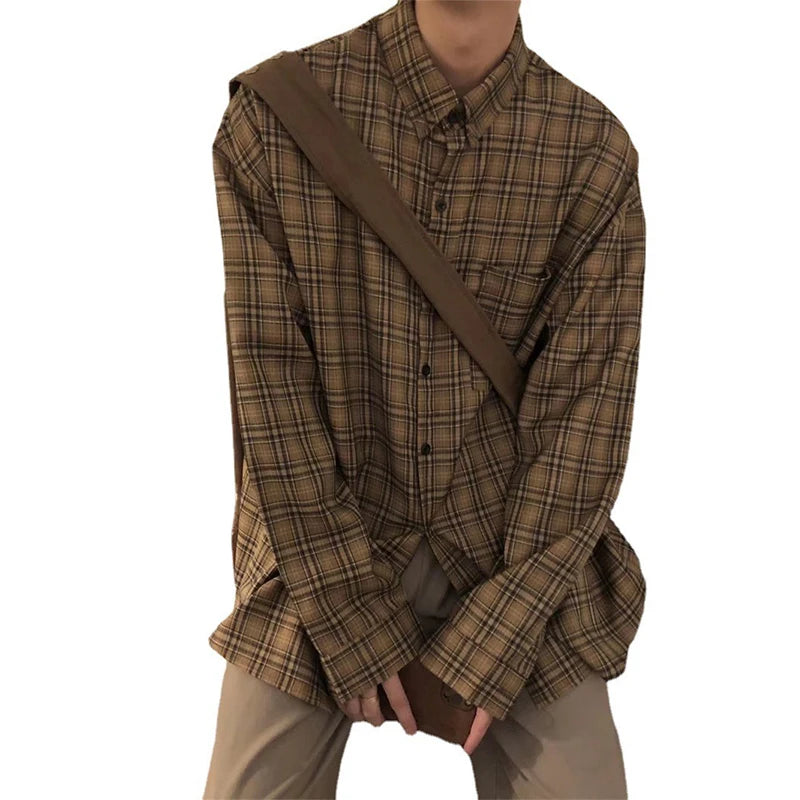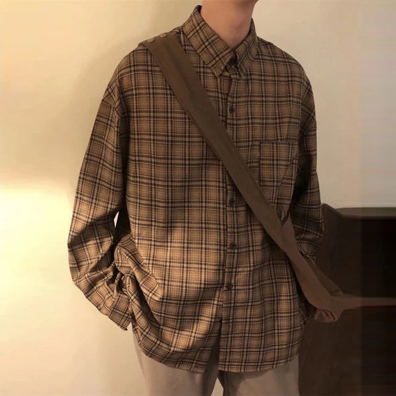 Spring Clothing Men's Casual Japanese Plaid Shirt Vintage Streetwear Turn Down Collar Button Long-sleeved Check Tops Stylish