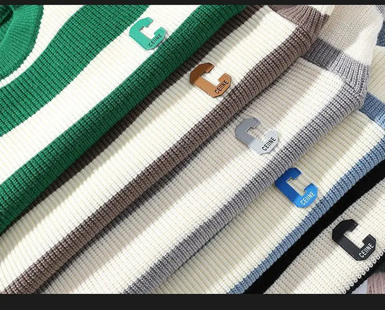 Autumn/Winter Men's Pullover Round Neck Loose Striped Contrast Letter Warm and Thick Casual Fashion Elegant Commuting Knitwear