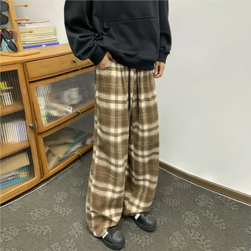 Winter Vintage Fleece Plaid Wide Leg Pants Men's Woolen Casual Thick Warm Pants Men Women Loose Straight Mopping Trousers