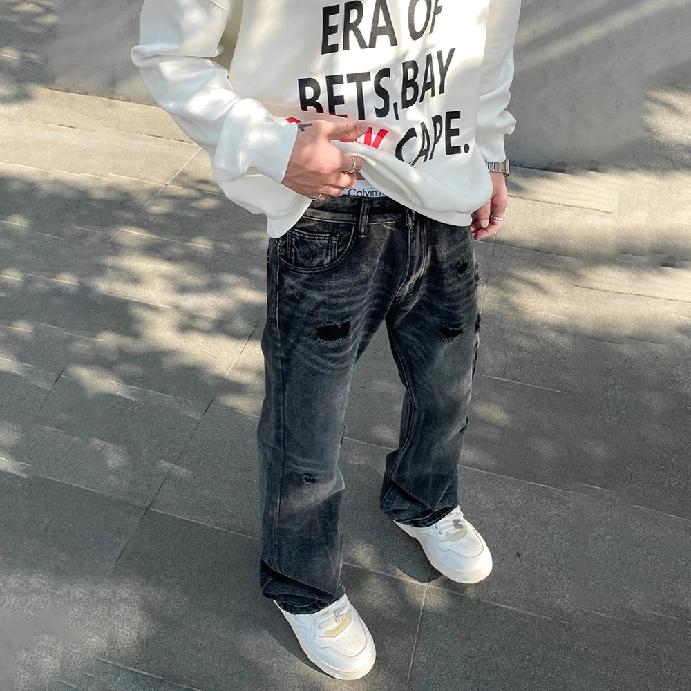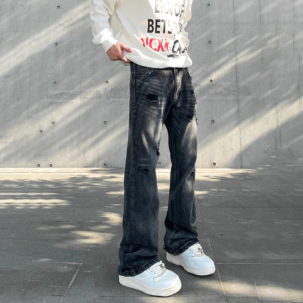 Streetwear Ripped Jeans Men Autumn Black Flared Trousers Casual Y2k Vaqueros Pantalones Hombre Winter Street Hole Denim Pants