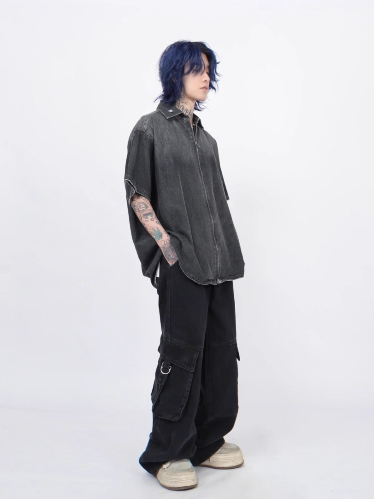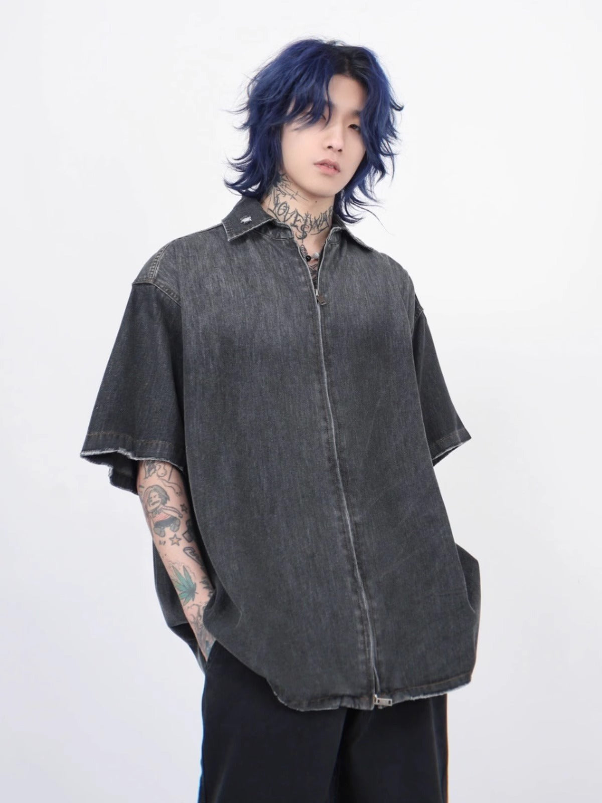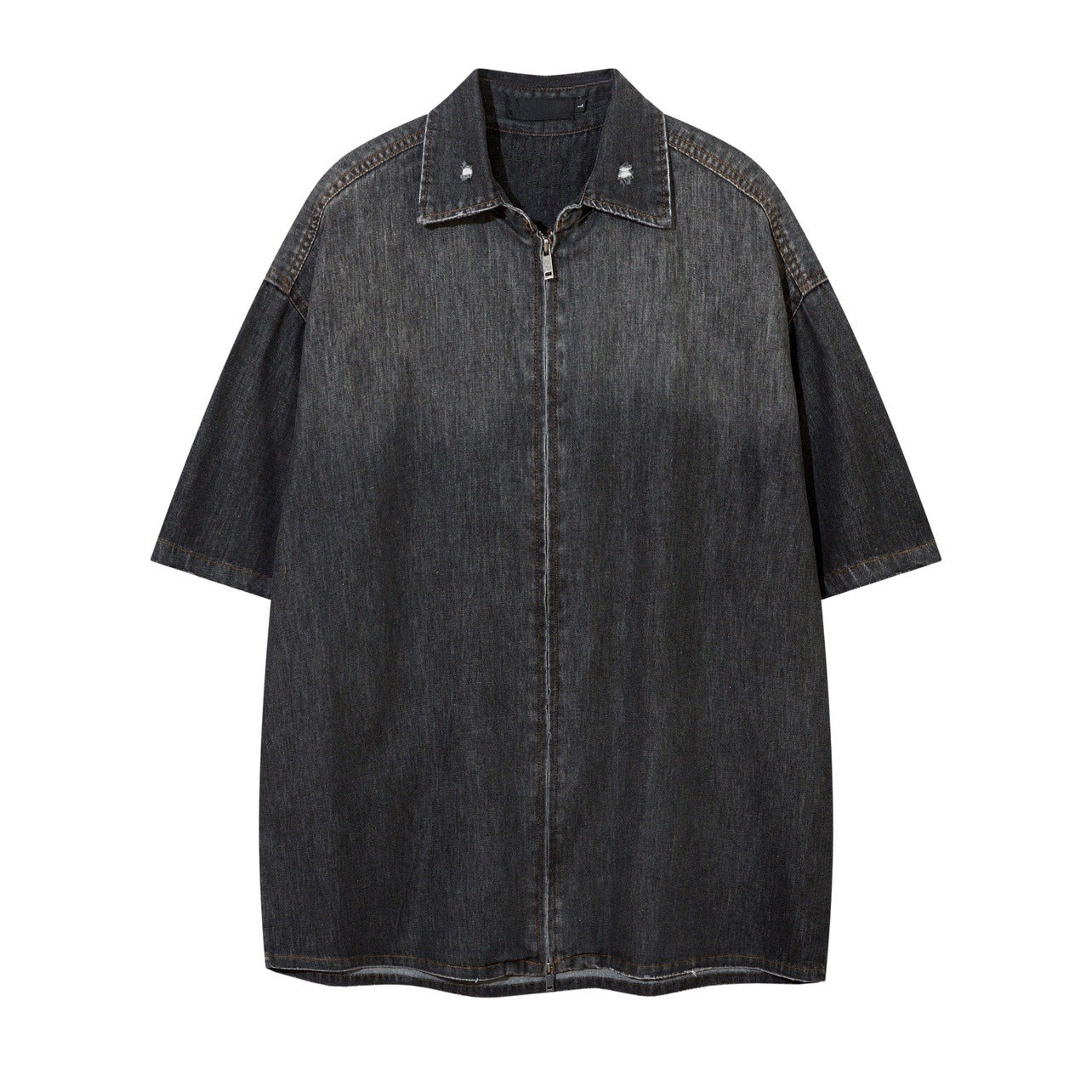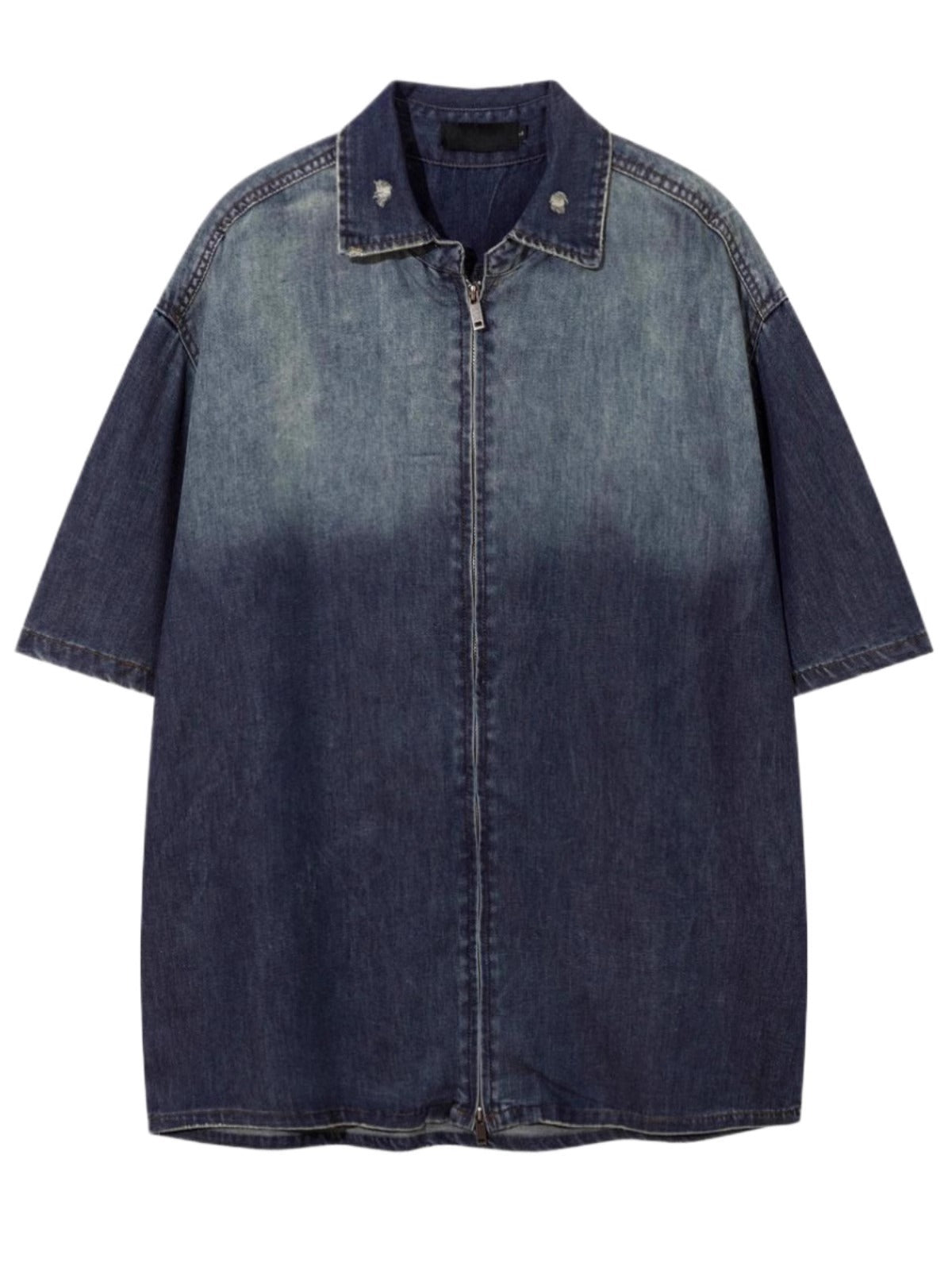 American high street gradient washed old denim short-sleeved shirt new summer ins trendy couple zipper shirt