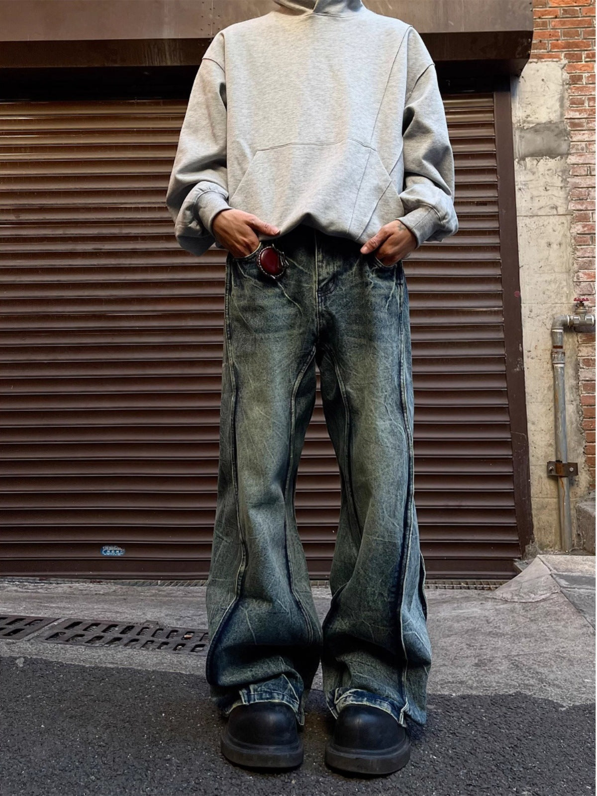 American street stitching silhouette jeans men's high street retro old lightning pattern straight loose casual long pants
