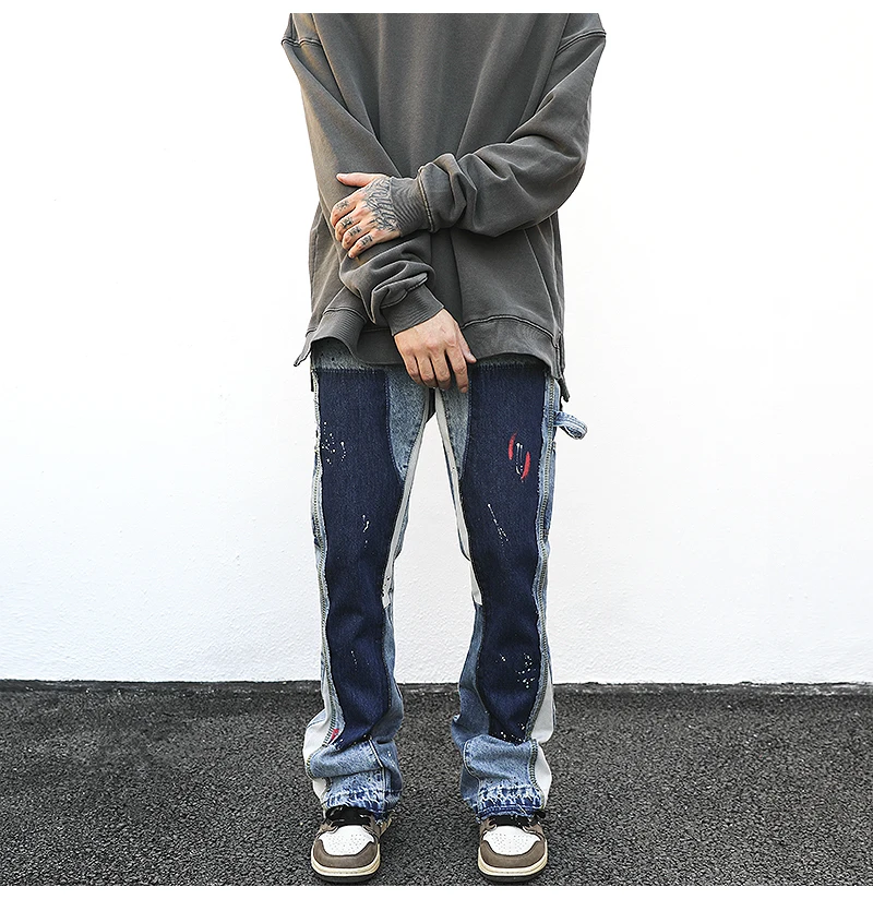 fashion: Distressed Splash Ink Flare Jeans Urban Streetwear Patch Mens Wide Leg