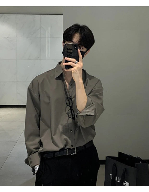 New Korean Business Men Shirts Light Luxury Slim-fit Solid Color Long Sleeve Cardigans Leisure Breathable Solid Color Basic Tops