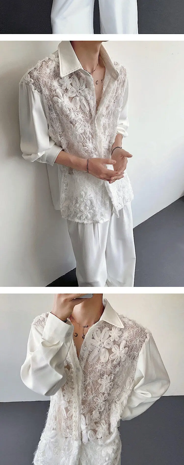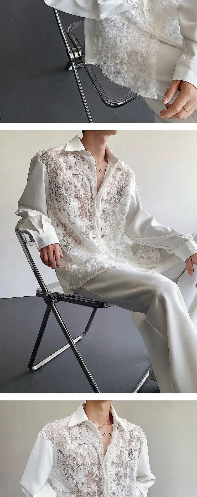 Niche Design Men Shirts Turn-down Collar Hollow Out Pearl Lace -up Patchwork Loose Solid Color Male Long Sleeved Top