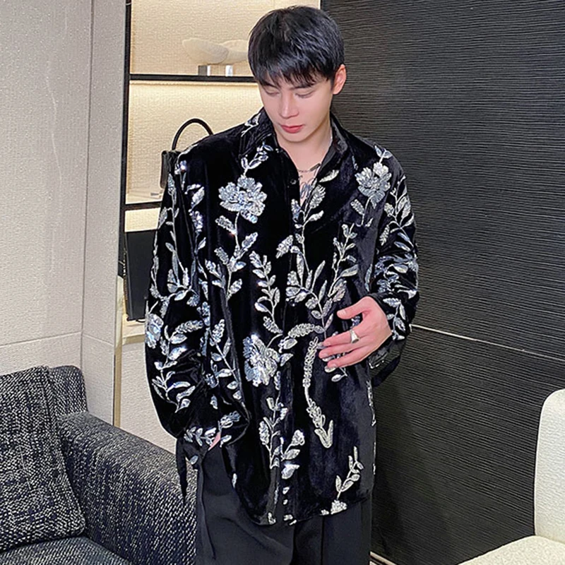 Personality Velvet Male Shirts Lace-up Sequin Embroidery Turn-down Collar Contrast Color Men's Long Sleeve Tops Tide
